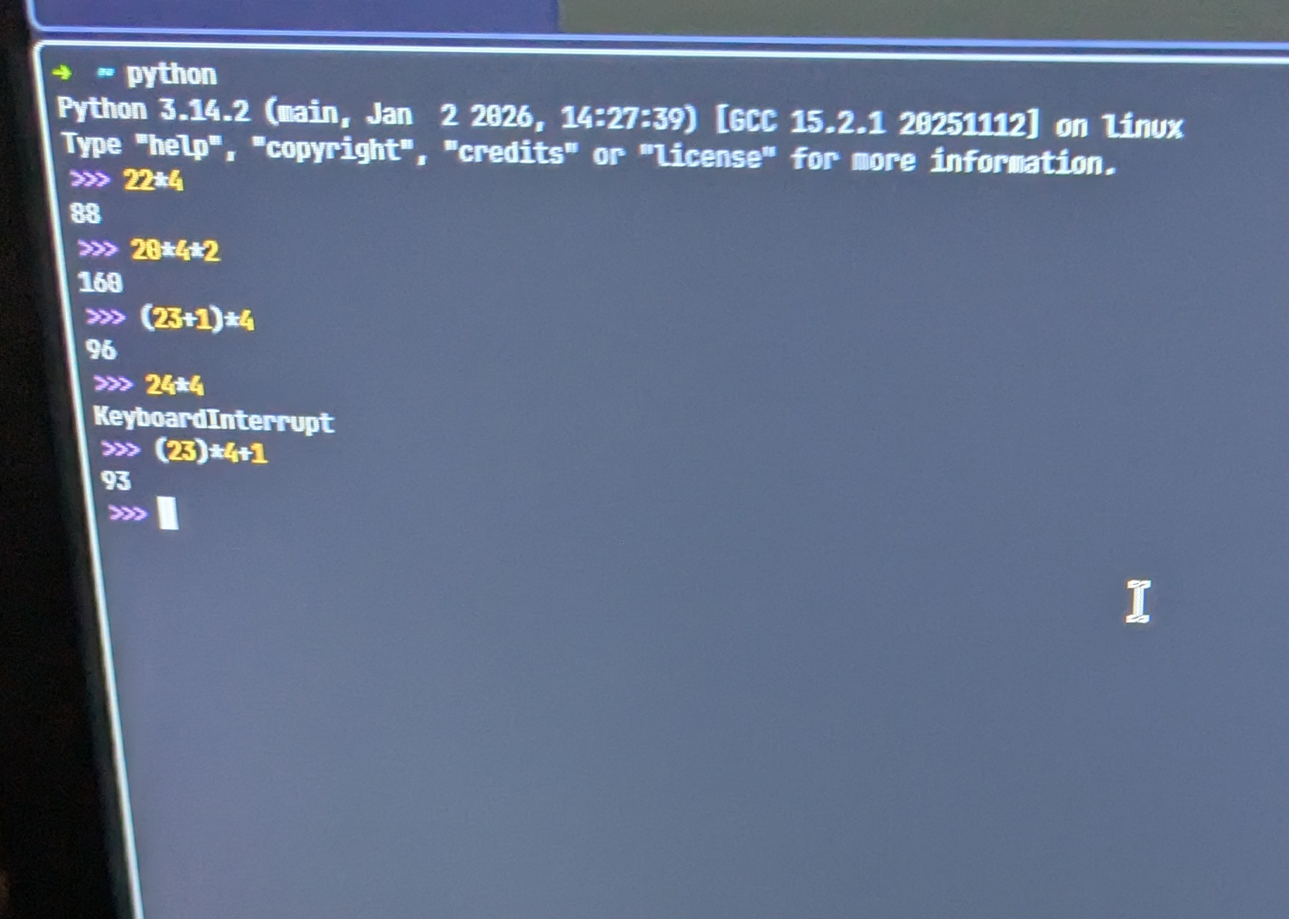 Me calculating via the Python REPL the number of sides I had just built.