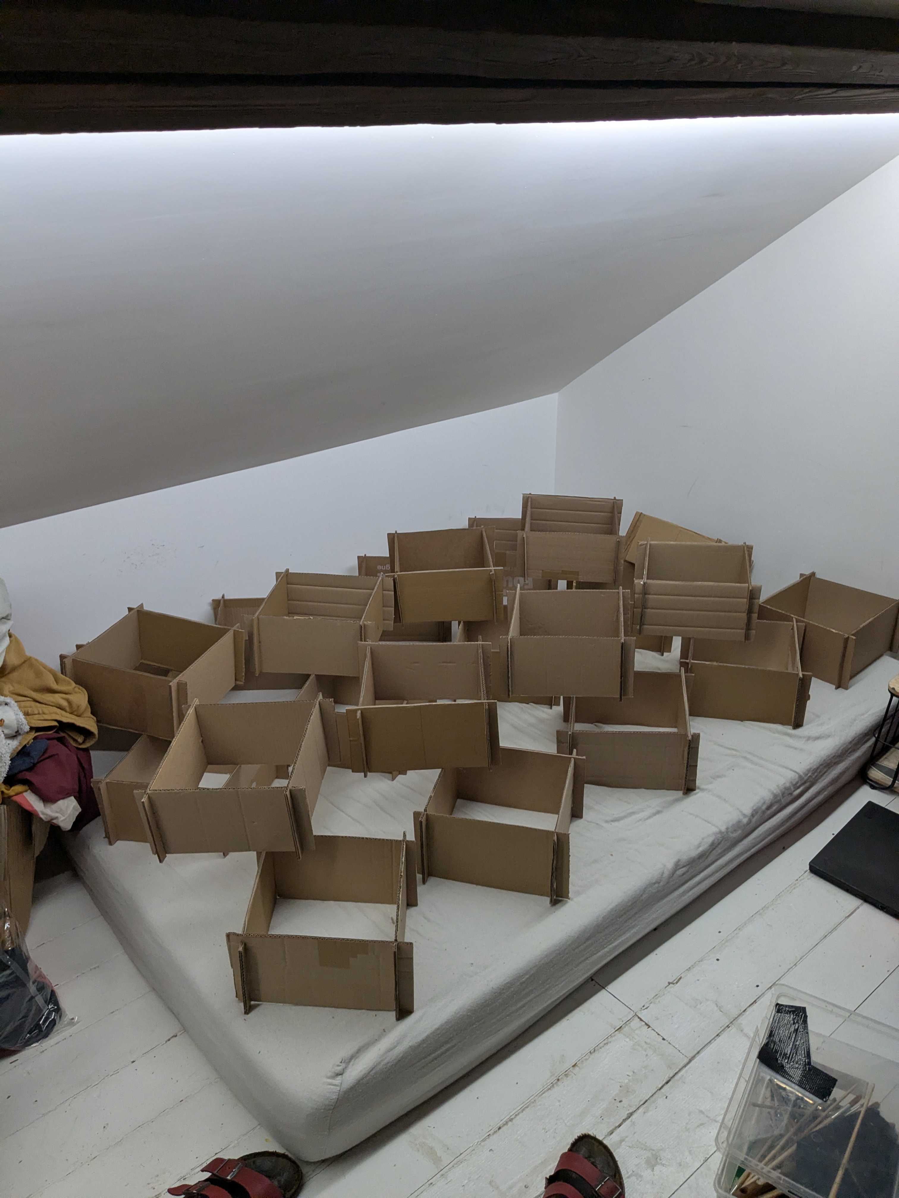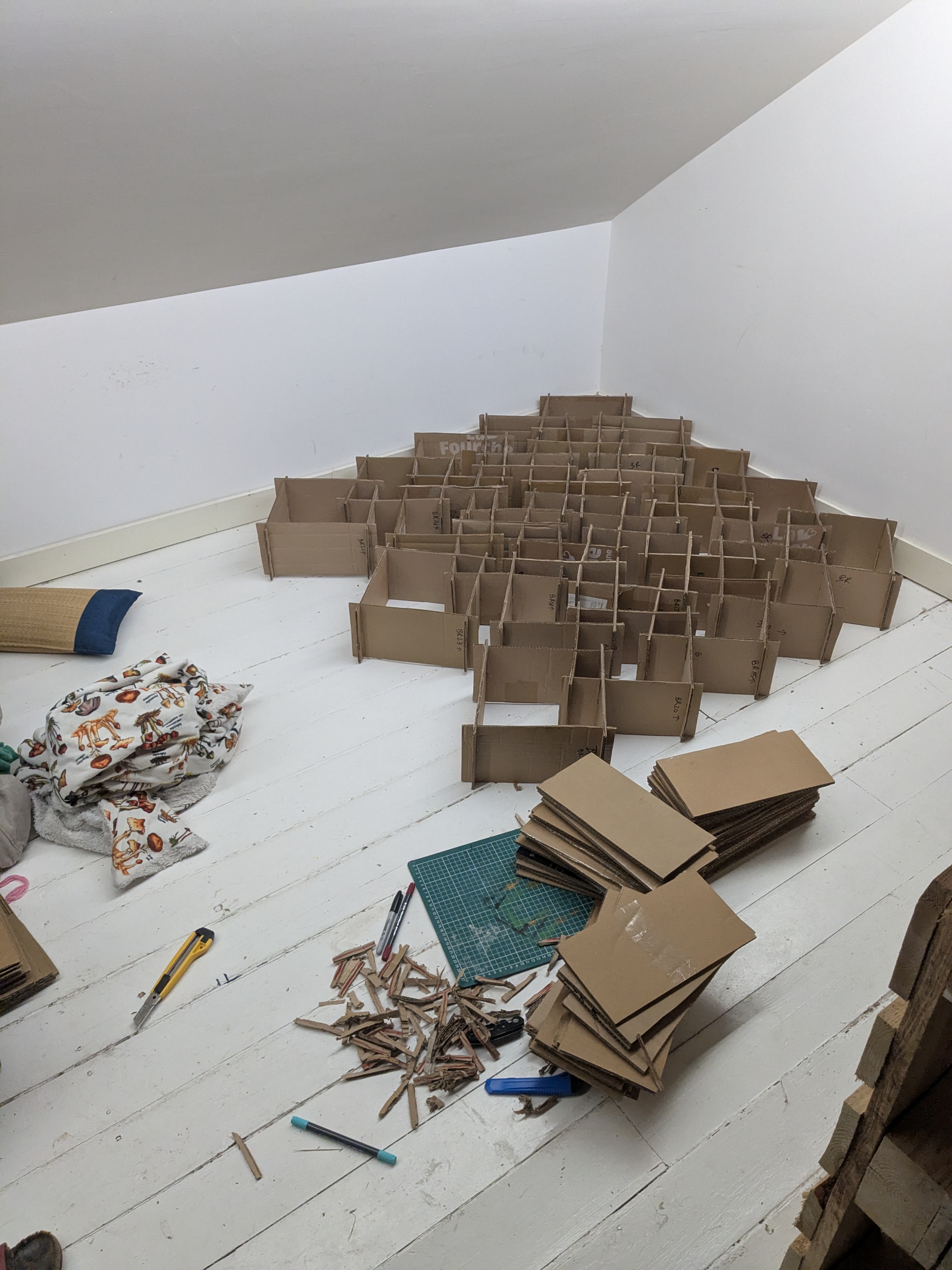 Having already amassed a large amount of cardboard, including the box in which came the new mattress my flatmate had bought themselves, I had just enough to make a bit over half the number of sides I needed to make.